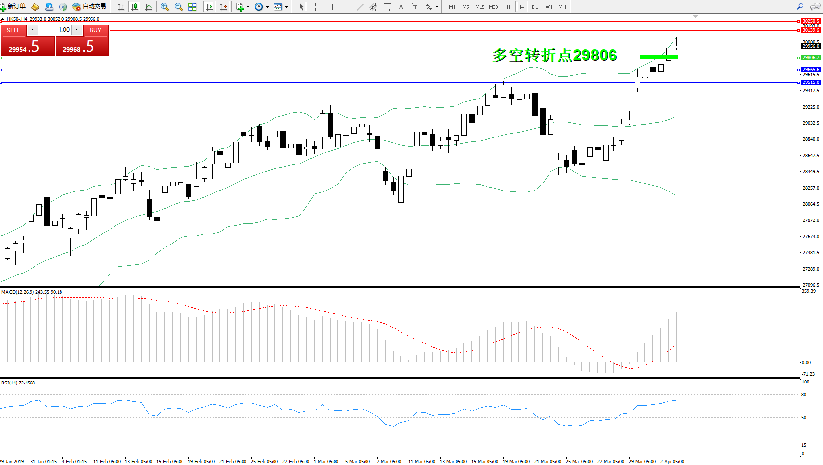 交易策略:29806上方看涨,目标30139、30250
