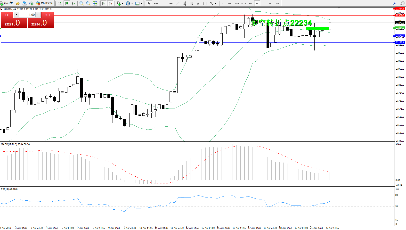 交易策略:22234上方看涨,目标22322、22367