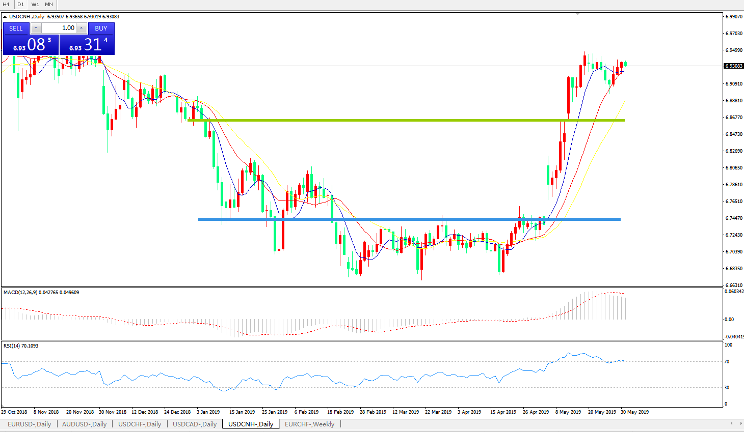 技术面简析:日线图均线整体维持攻势,短期均线开始走弱,MACD在0轴上方运行且动能柱轻微缩量,RSI超买区域附近弱势运行,汇价强力上攻后宽幅强势整理,预计短期汇价有下行回踩需求,中期重点关注中美贸易争端后续进展。