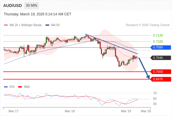 交易策略: 在 0.7080 之下,看跌,目标价位为 0.7000 ,然后为 0.6975 。