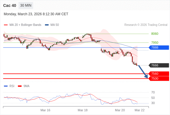 Cac 40 当日内: 短期关键阻力位在7888。