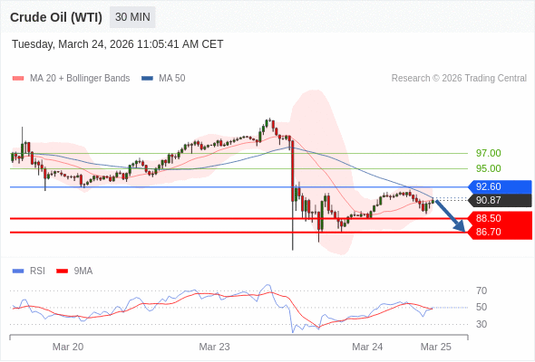 交易策略: 在 92.60 之下,看跌,目标价位为 88.50 ,然后为 86.70 。