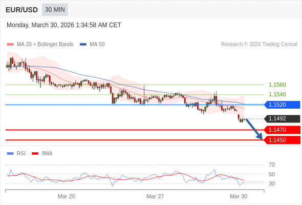 交易策略: 在 1.1520 之下,看跌,目标价位为 1.1470 ,然后为 1.1450 。