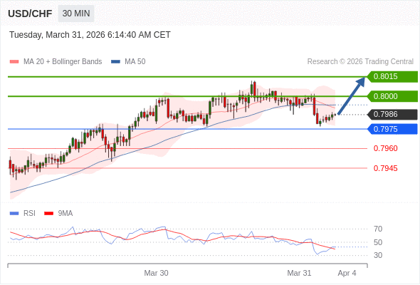 美元/瑞郎 当日内: 在0.7975之上,看涨。