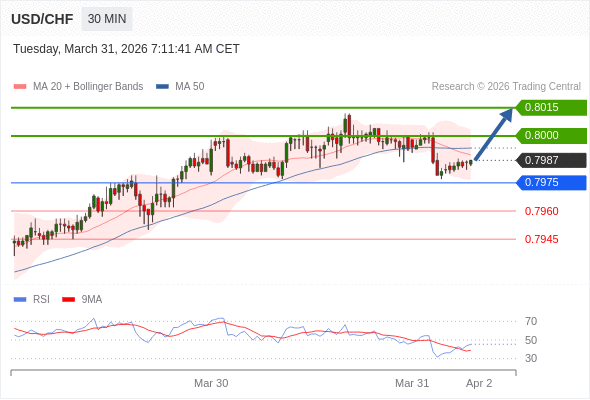 在 0.7975 之上,看涨,目标价位为 0.8000 ,然后为 0.8015 。