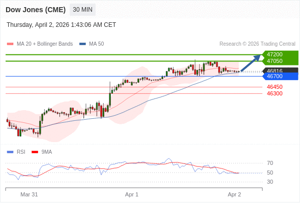 在 46700 之上,看涨,目标价位为 47050 ,然后为 47200 。