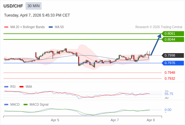 美元/瑞郎 当日内 : 看涨,当 0.7976 为支撑位。