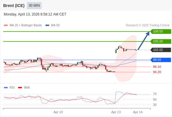 布伦特原油 (ICE) (M6) 当日内: 在98.50之上,看涨。