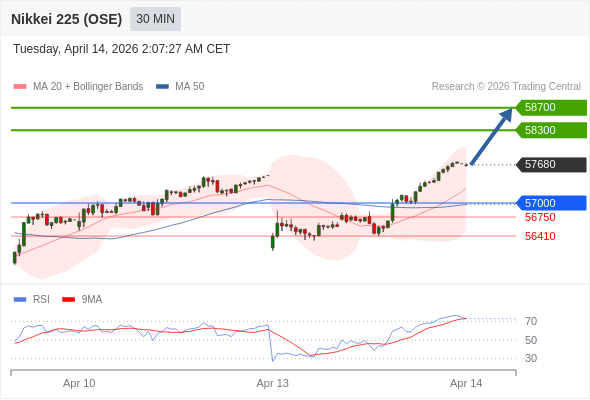 在 57000 之上,看涨,目标价位为 58300 ,然后为 58700 。