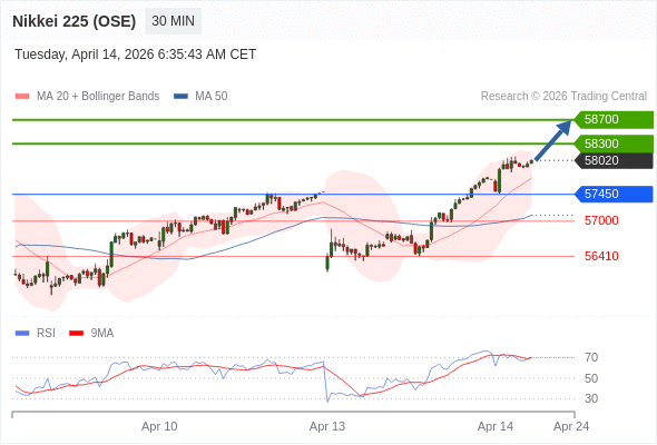 在 57450 之上,看涨,目标价位为 58300 ,然后为 58700 。