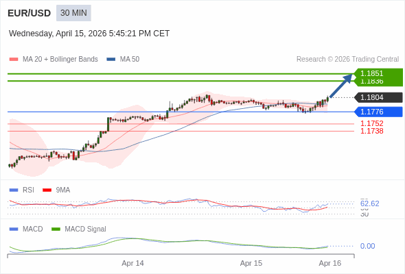 欧元/美元 当日内 : 看涨,当 1.1776 为支撑位。