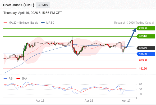 在 48520 之上,看涨,目标价位为 48910 ,然后为 49090 。