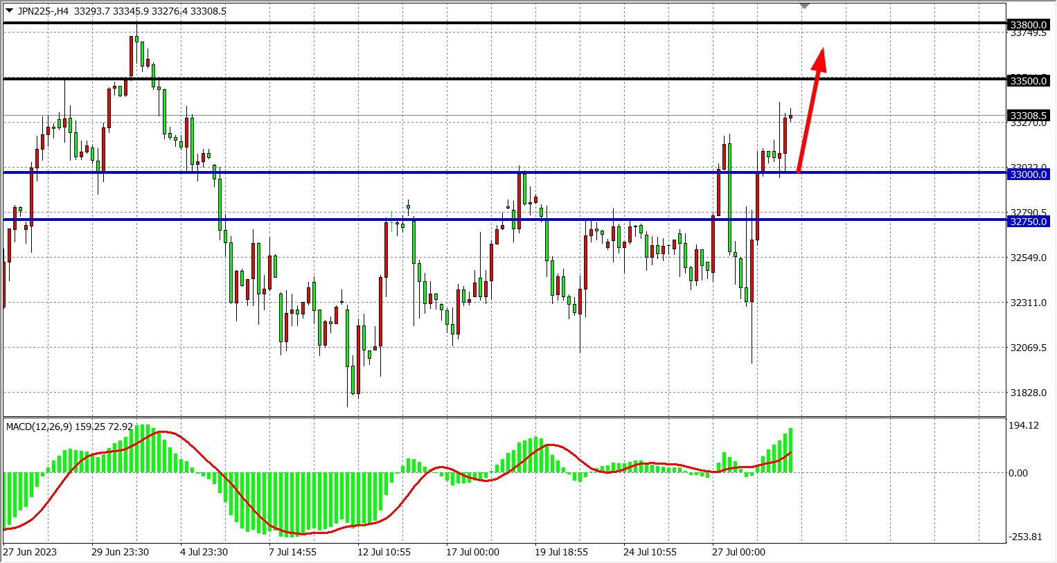 周一(7月31日)日经225指数收盘上涨438.50点,涨幅1.34%,报33205.00点