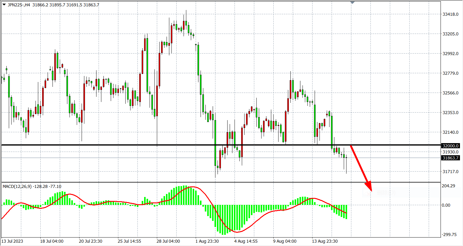 4小时图看,日经指数围绕32000徘徊,MACD量能下穿零轴,多头趋势转弱,支撑关注阻力关注32000-32350。