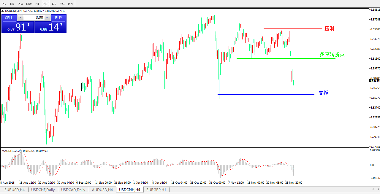 交易策略: 在6.9089之下,看跌,目标价位为6.8505,然后为 6.8350 。