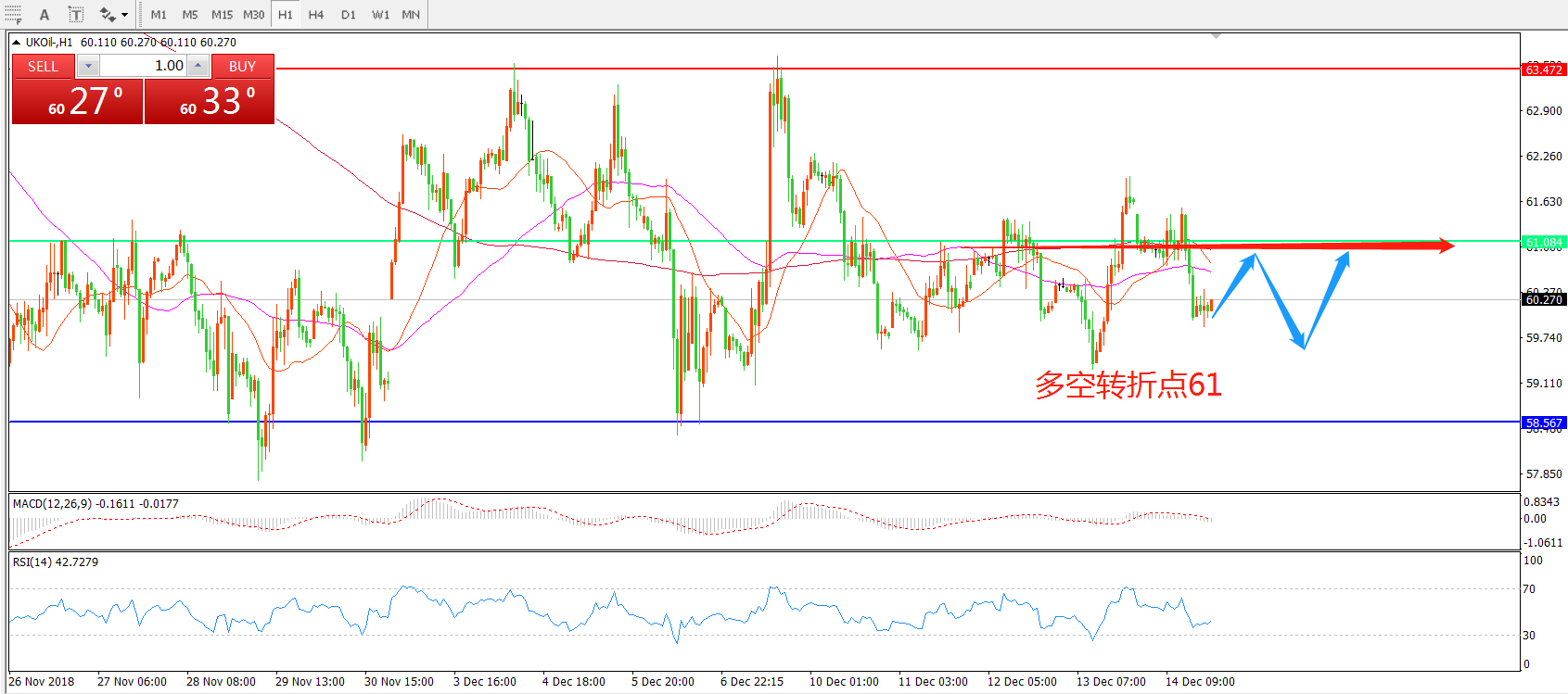 交易策略:在61.00之下看跌,目标58.00    55.00