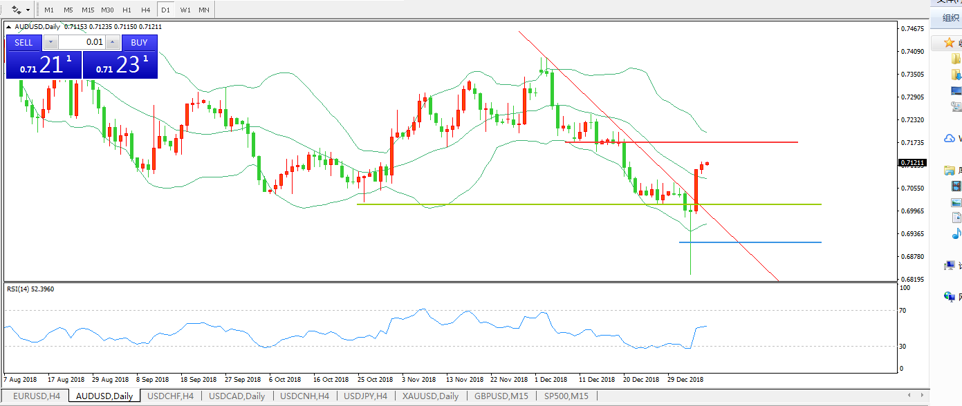 技术面简析:布林带开口开始拐头价格升穿布林中轨,RSI拐头向上攻击,下降趋势线被击破,预计短期汇价将延续上行态势