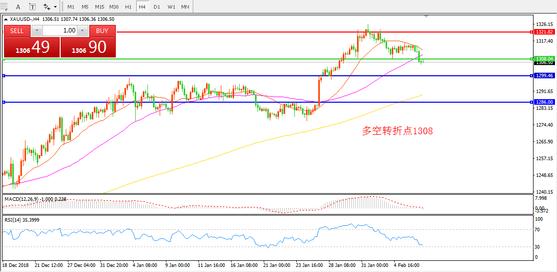 交易策略:在1308.00之下看跌,目标1300.00  1280.00