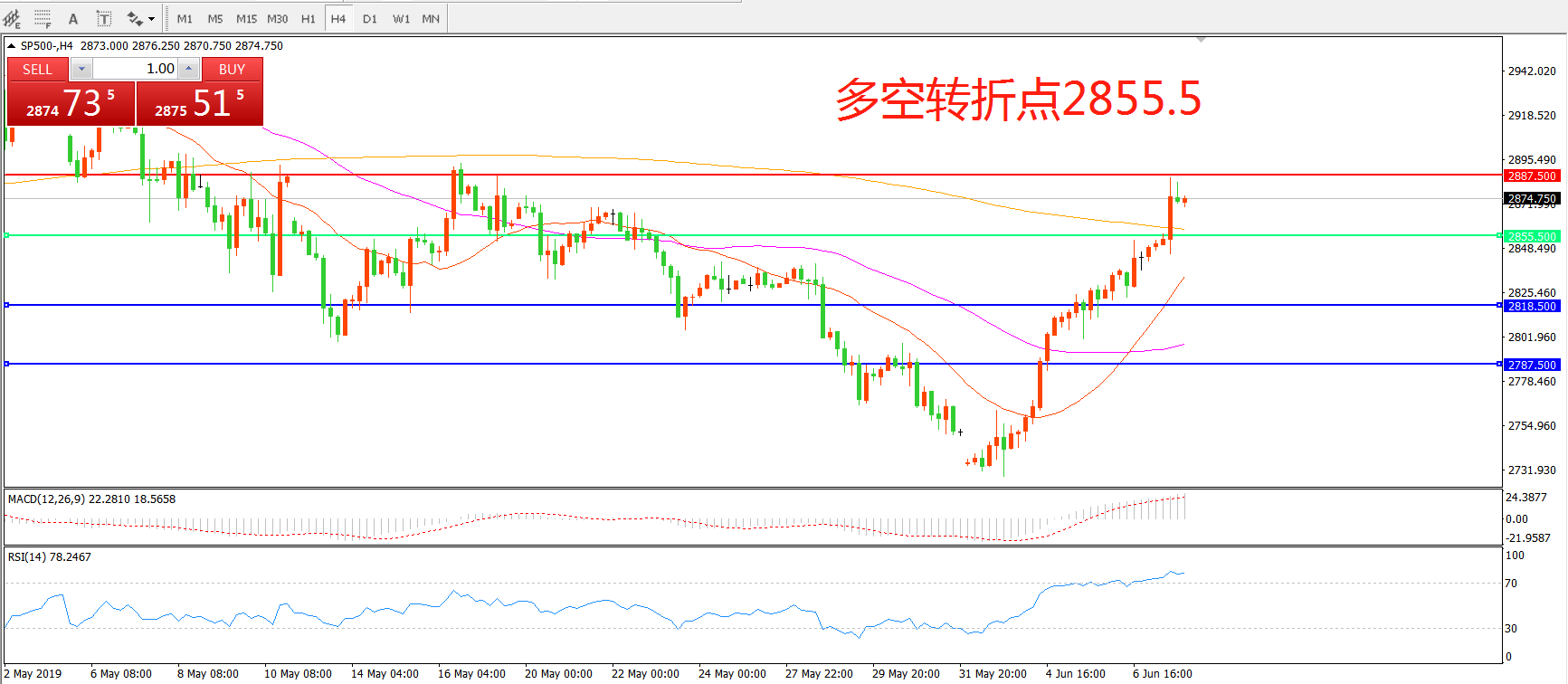 4小时图看,标普低位长阳连续反弹,触碰2877.5阻力后小幅回落,整体表现强势,MACD红柱增加,RSI指标走平,日内有延续反弹可能。