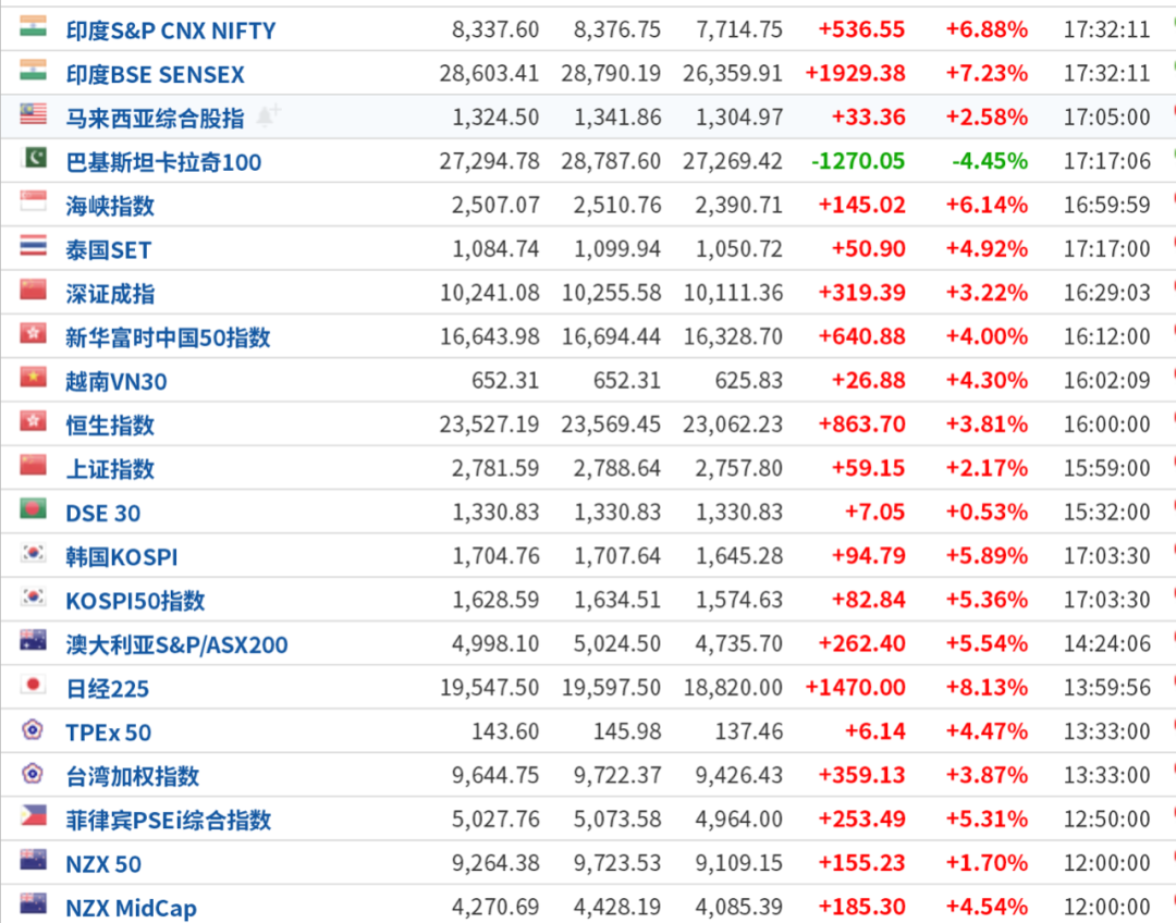 此外,各国股市迎来反弹高峰。澳大利亚ASX200指数收盘上涨5.54%,报4998.1点;新西兰NZX50指数涨1.7%,报9264.38点。越南VN指数涨幅扩大至4%,为2012年3月以来最大涨幅。目前,仅巴基斯坦股市指数报跌4%以上。