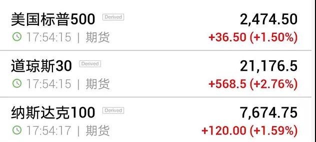 受此消息影响,美股三大股指期货午后均开始由跌转转涨,道指期货一度涨超4%以上。截至下午17点50分左右,美股期指涨幅进一步扩大,道指期货涨超2%,标普500、纳指期货涨超1.5%。