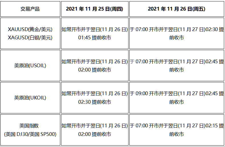 1.外汇货币对和其他股指产品的交易不受本次美国感恩节假期休市影响。