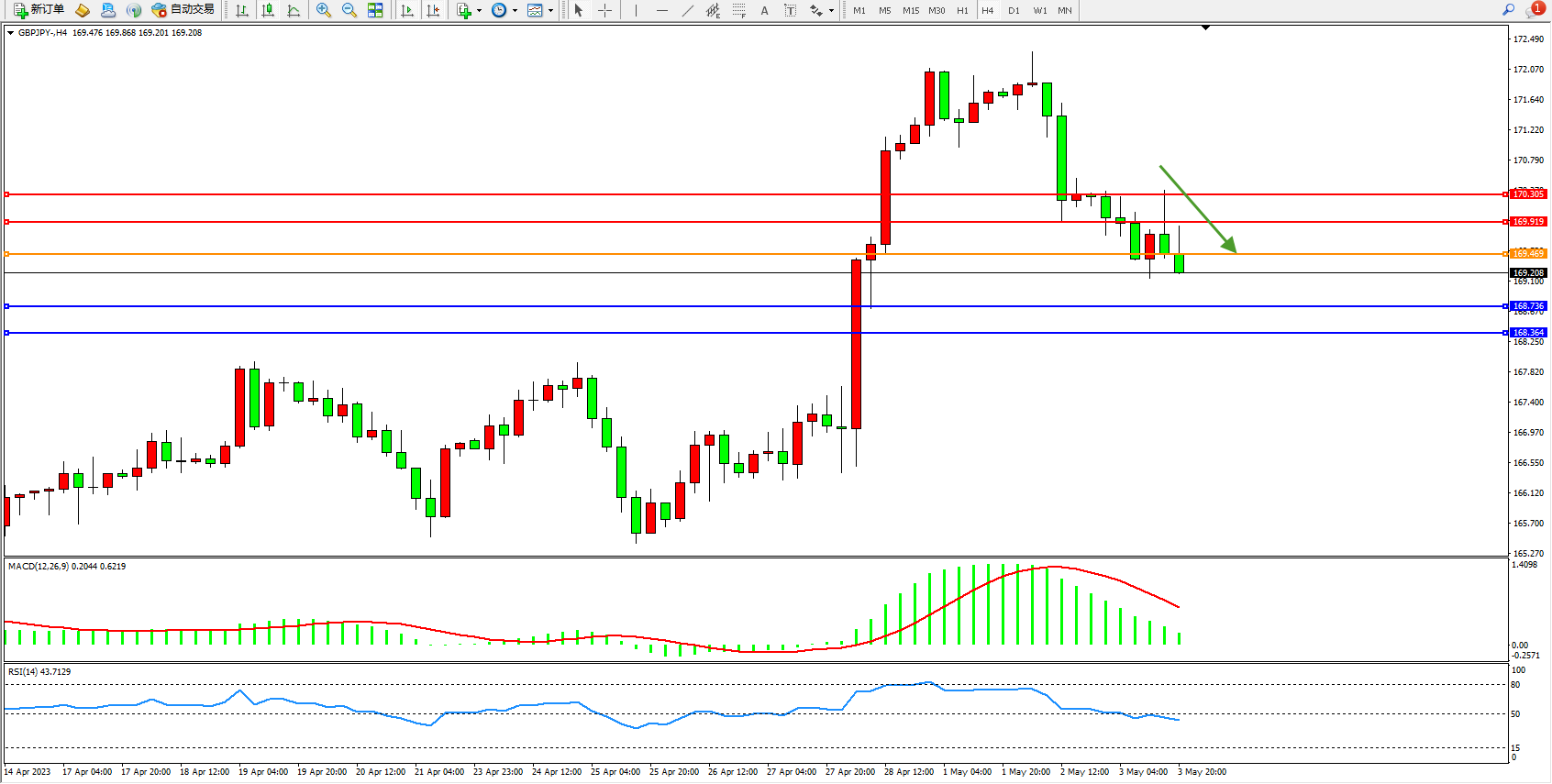 交易策略:169.469下方看跌,目标168.736  168.364